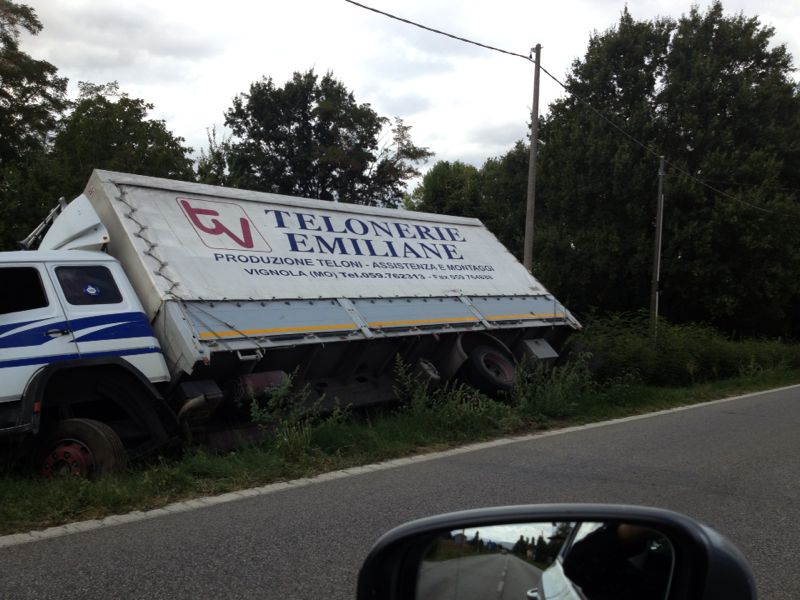 Un tir fuori strada a Cento di Budrio sulla Zenzalino. Sembra non ci siano danni a persone e sembrerebbe che il convoglio non abbia creato danni ambientali. La circolazione è abbastanza fluida, tranne naturalmente i rallentamenti più dovuti ai “curiosi” che non alla situazione stradale, benchè la rimozione del mezzo richiederà presto attività stradali importanti.